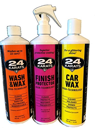 #1 Selling in Canada, 24 Karats High Technology Car Wash Kit, Includes Biodegradable Wash & Wax, Finish Protector (for interior or exterior use) and Car Wax For Professionel Shine - Set of 3